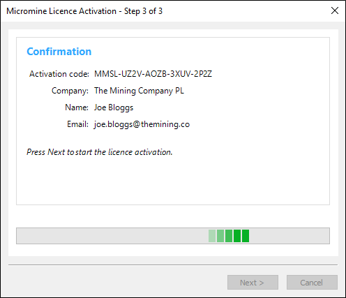 - Press Next to start the licence activation: