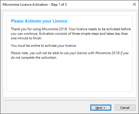 If you installed Micromine Origin & Beyond for the first time on the destination computer, the following screen will appear when you start the application. Click Activate new licence online.