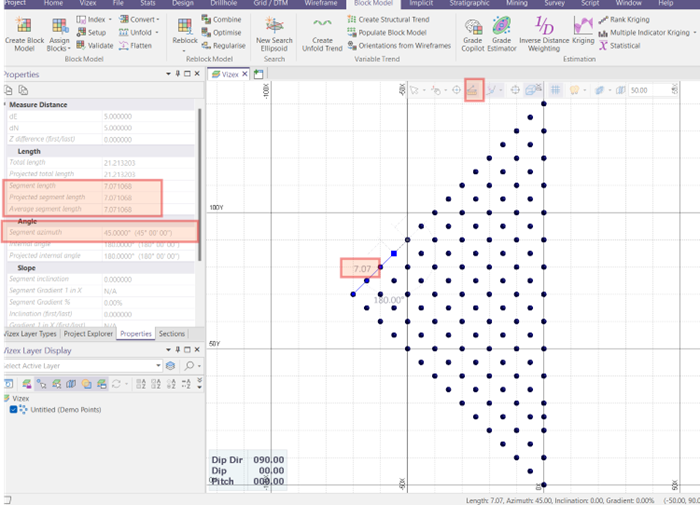 Let’s say you import some geophysical data points and would like to visualize it as a block model file. First, identify the distances between points along all axes (X, Y, Z) and determine if a rotation is needed.