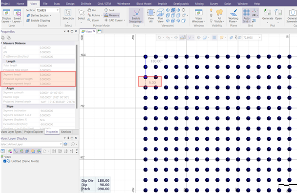 In the example below, we measure point spacing in different axes, with distances of 7.07 and 5 in the X and Z directions, respectively, and an azimuth of 45° in the Y direction.