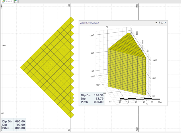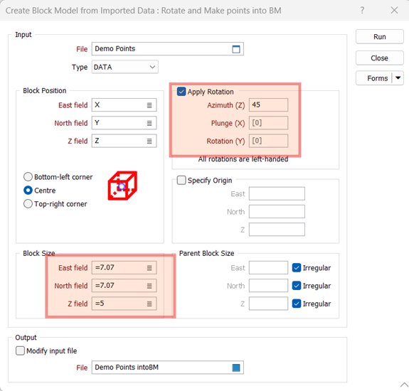 With this information, we can proceed by navigating to Block Model > Create Block Model from Imported Data. Here, we’ll define the rotation and specify the block size based on our measurements (45° rotation, and block sizes of 7.07 in the X and Y axes and 5 in the Z axis).