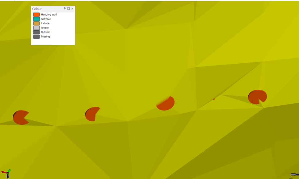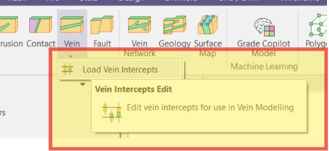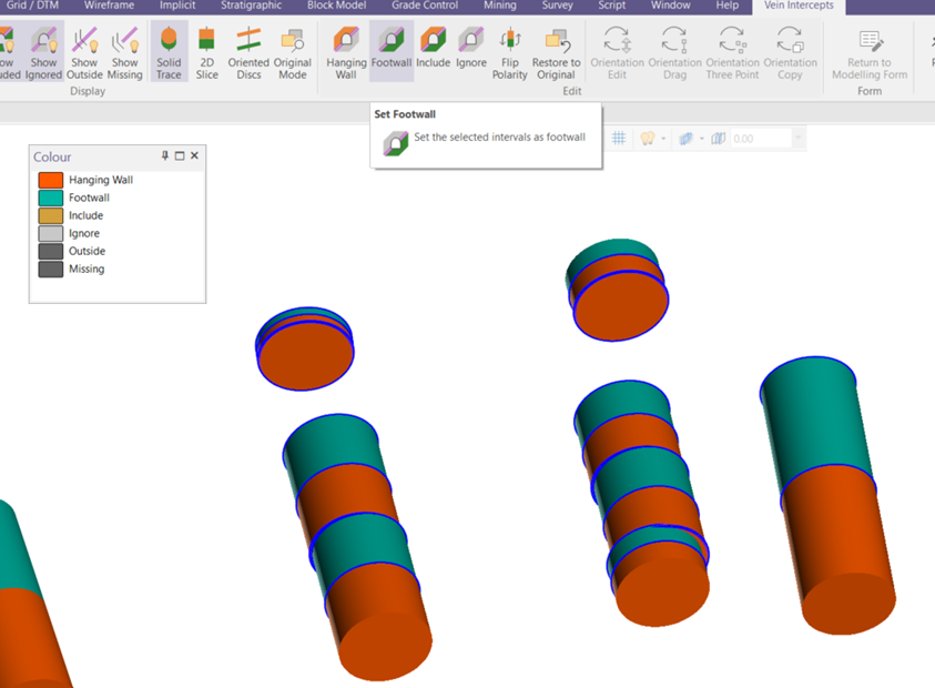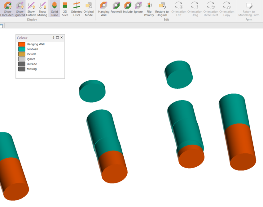 You can load this Vein Intercept file from a drop-down menu on the vein toolbar. Based on your preference, you can switch between viewing the model as a Solid Trace or as Oriented Discs, which can be manually modified individually or in groups.