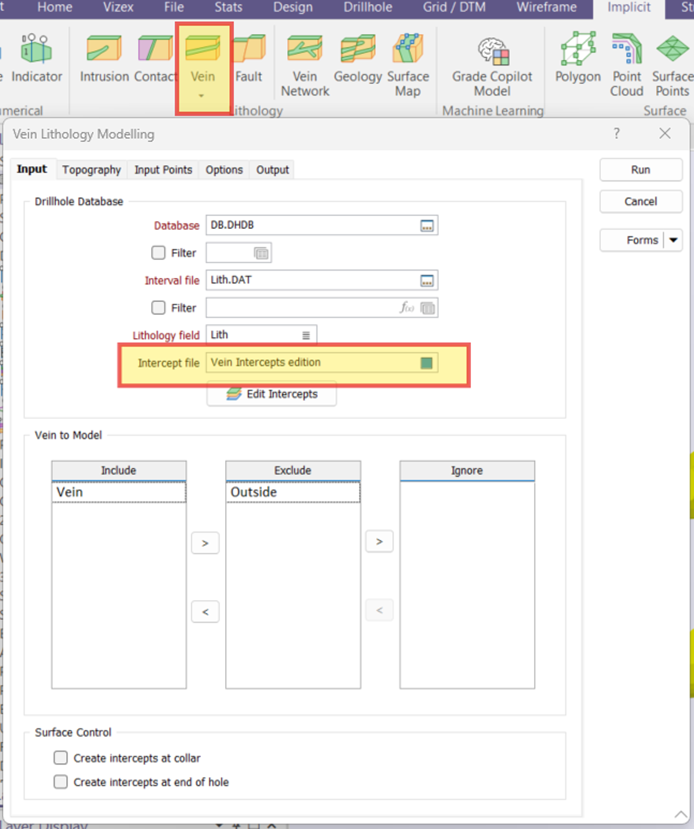 Creating a vein using implicit modeling is both straightforward and powerful. Recently, a new tool called the Intercept File has been introduced to provide geologists with a very handy way to handle erratic, narrow veins—especially when numerous underground samples are involved that can sometimes result in unrealistic or unwanted shapes.