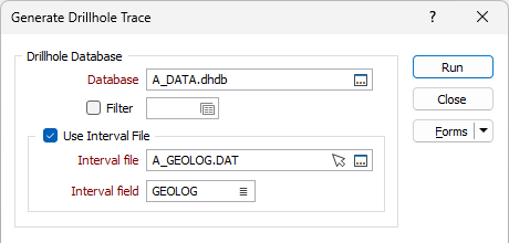 The trace is calculated from the collar and, where available, survey data stored in the Drillhole Database.