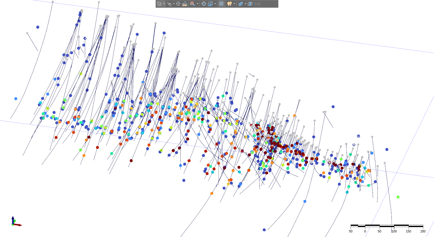 Figure 2: Visualisation of extracted maximum Au values along drillhole traces