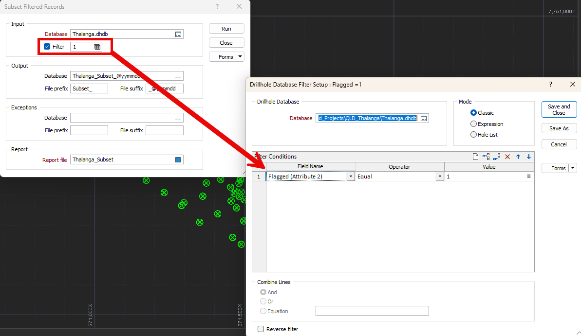 Figure 3: Subsetting an existing drillhole database using a collar-based filter.