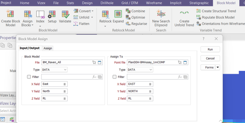Next, composite the planned drillhole intervals at a suitable length (for example, 1 m), then use Block Model → Assign Blocks to assign the required block model grade fields directly to the planned drillhole composites. The block model values are written onto the composites along the planned drillhole trace, allowing predicted grades to be reviewed and visualised.