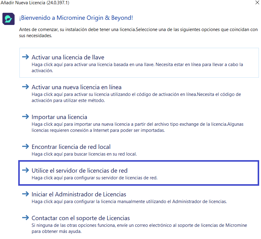 2. En la ventana de Bienvenido a Micromine Origin & Beyond, haga clic en Utilice el servidor de licencias de red.