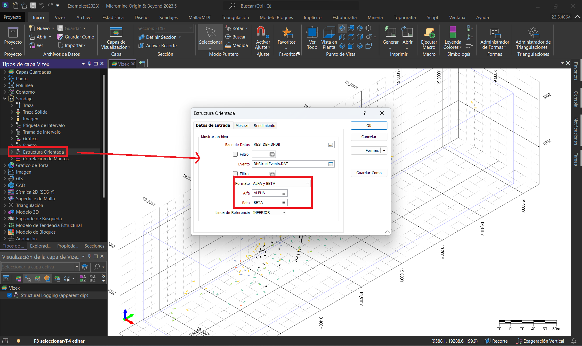 2. Haga doble clic en Estructura Orientada bajo Sondaje en Tipos de capa Vizex. Después de elegir el archivo de eventos de su base de datos, seleccione el formato de sus mediciones y asigne los campos apropiados; este ejemplo está utilizando el formato alfa y beta.
