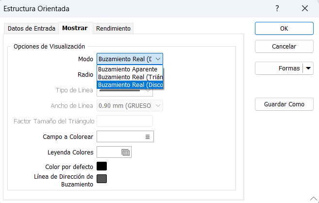 3. Seleccione la opción de visualización; el Buzamiento Aparente se mostrará como una línea 2D, mientras que el Buzamiento Real se mostrará como un triángulo 3D o un disco.