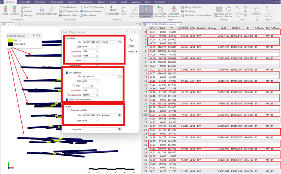 Para resolver este problema, vaya a la pestaña Sondaje y utilice la opción “Insertar intervalos ausentes” para agregar los intervalos ausentes en este archivo de intervalos.