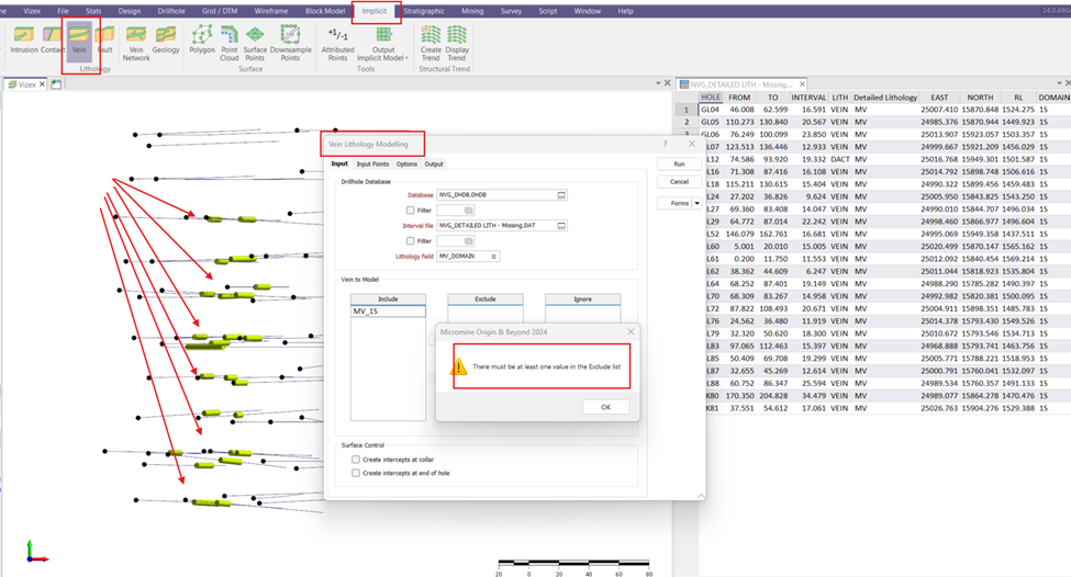 Después de codificar y ejecutar el proceso en la herramienta de Modelado de Vetas, recibe el siguiente mensaje: “Debe haber al menos un valor en la lista de exclusión.”