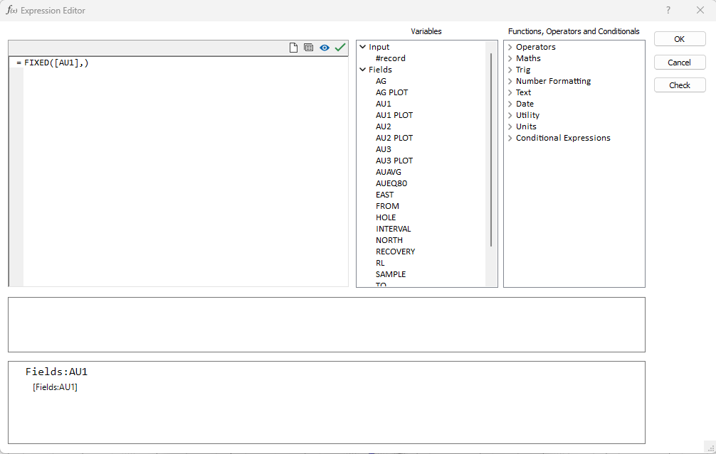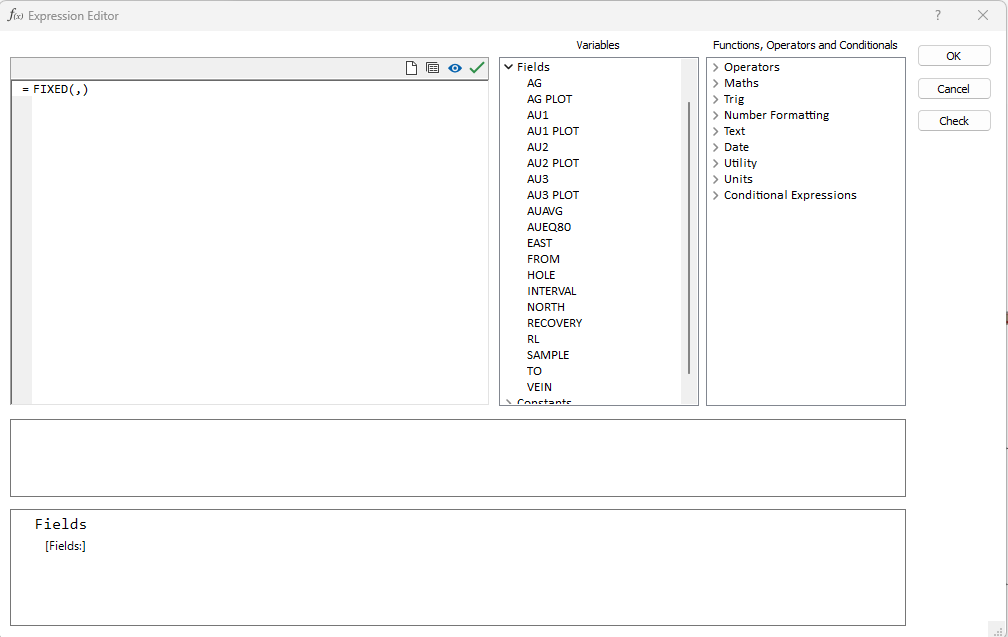 En la ventana que aparece, debe escribir una expresión a través de Number Formatting, seleccione el comando FIXED, luego seleccione Variables. En Variables, haga clic en la línea Fields y seleccione los datos que se mostrarán allí.