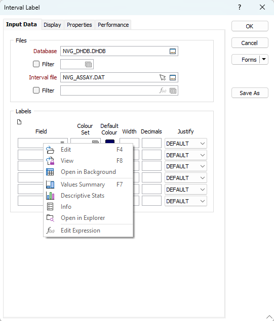 Esta instrucción le permitirá visualizar múltiples valores a la vez. Vaya a Visex Layer Types - Interval Label. En el cuadro de diálogo que se abre, seleccione Database e Interval File.