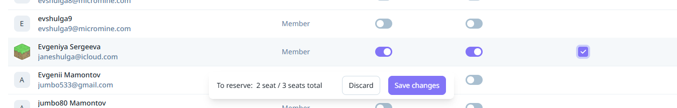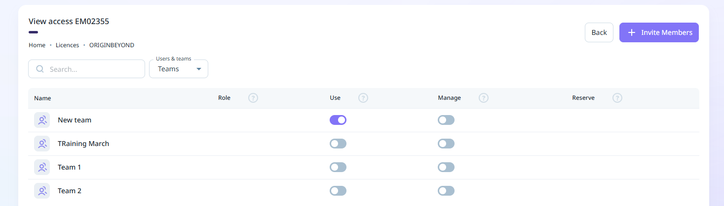4. Para garantizar que un asiento esté siempre disponible para un usuario específico, resérvelo para ellos (opcional). Si habilita el permiso de Uso para un usuario individual, la opción de Reservar estará disponible para ellos en la página de Gestión de Licencias. Habilite esta opción y guarde los cambios.