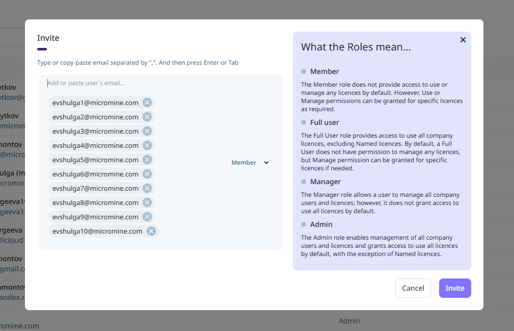 Puede copiar y pegar una lista de direcciones de correo electrónico para invitarlos a la licencia, o ingresarlas manualmente.