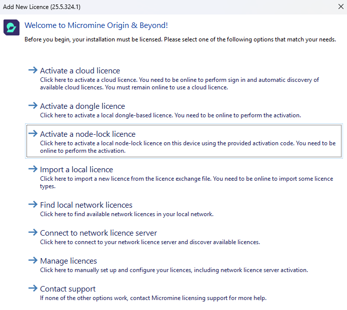 Este artículo le guiará a través de los pasos para activar una licencia node-locked tanto para Micromine Origin & Beyond como para Origin & Beyond para Team Viewers.